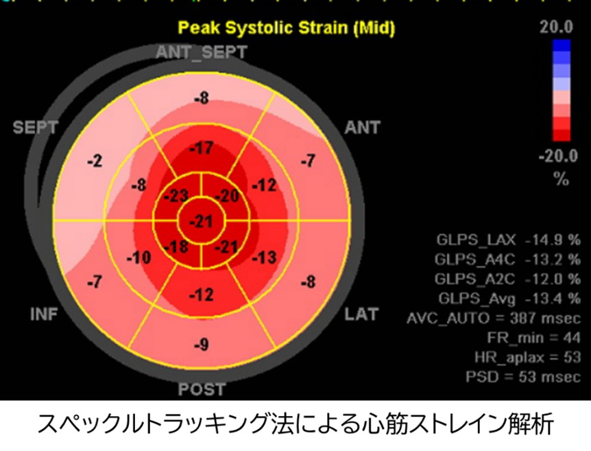 心エコー検査の結果が疾患を疑うきっかけになることもあり、気になる症例では積極的に解析を行う様にしています。 当科の特色としては閉塞性肥大型心筋症に対する経皮的中隔心筋焼灼術(PTSMA)を行っていますので、術中評価を含め多数の心筋症症例の検査を実施しています。