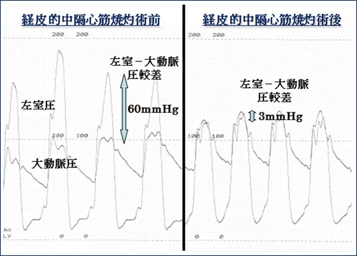 経皮的中隔心筋焼灼術(PTSMA)は1995年より欧州で始まり、薬物治療無効例に対し、心筋切除術の代替治療として位置づけられる治療法です。治療の仕組みは、カテーテルを用いて、左心室の出口(流出路)を圧排する肥大心筋に流れる血管、「中隔枝」(左冠動脈前下行枝の分枝)にエタノールを極少量注入して、肥大心筋を焼灼し、薄くすることによって左室内圧較差を減らす治療法です。本治療の最大の特徴は、「低侵襲性」(体力の消耗や傷口が小さいこと)です。カテーテル治療担当医(前川)が数人の医師とともに、経胸壁心臓エコーを併用しながら担当、治療を行います。カテーテル治療は基本的に局所麻酔で行い、治療に要する時間は3時間前後です。当院では、治療を行う前に、事前に1週間弱の検査入院をして頂いている関係上、治療当日は事前の検査結果を参考に治療を行っています。治療にともなう入院期間は2週間前後です。カテーテル治療の成否は、治療終了時の左心室と大動脈の圧較差で判定します。カテーテル治療後は、閉塞性肥大型心筋症外来にて、心臓超音波、心臓CT、心臓MRIおよび心肺運動負荷試験などを施行させて頂き、治療効果の判定および評価を行います。