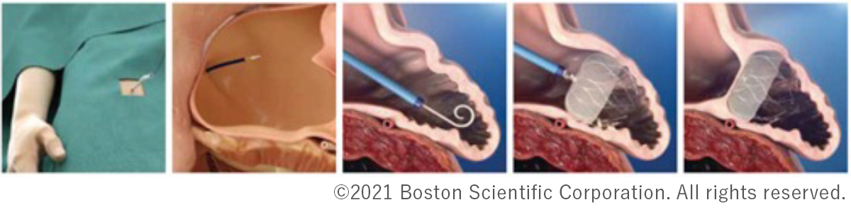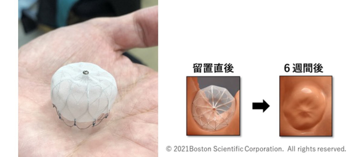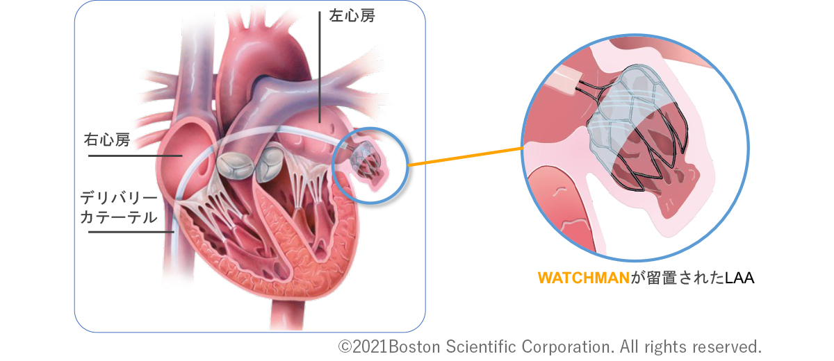 左心耳閉鎖デバイス(WATCHMAN®)は、約200μmのメッシュ構造のポリエチレンテレフタレート(PET)製のフィルターとナイチノール製フレームで構成されており、フレームのアンカーを左心耳内部に展開することで、入口部をメッシュ構造のフィルターで覆うことが可能となります。メッシュ構造のフィルターは、動物実験では術後6週をめどに内皮化するとされており、左心耳を閉鎖することが可能となります。左心耳をメッシュ構造のフィルターで閉鎖することにより、左心耳内に形成された血栓が左心房内に流出するのを防ぎ、血栓塞栓症を予防することが可能となります。また、本治療を行うことで、術後約6週間は抗凝固療法と抗血小板療法を併用する必要がありますが、それ以降は、抗凝固療法を中止することができる可能性が高く、長期的には出血リスクを軽減することが見込まれます。